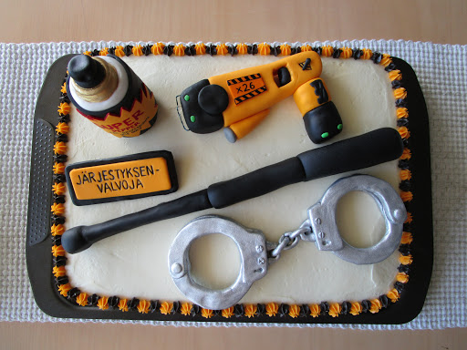 | Kakun koristeiksi tein sokerimassasta käsiraudat, teleskooppipatukan, pippurisumutteen, etälamauttimen ja järkestyksenvalvoja -kyltin. |